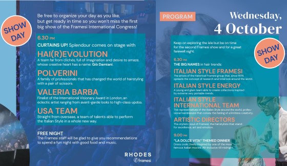 Framesi’s International Congress 2023 will take place October 1-5 at Rodos Palace Hotel in Rhodes, Greece. It’s the international event that brings us together, excites and enriches us in the name of hair fashion. Here are 10 great reasons to join us!