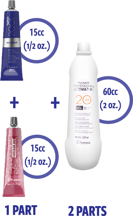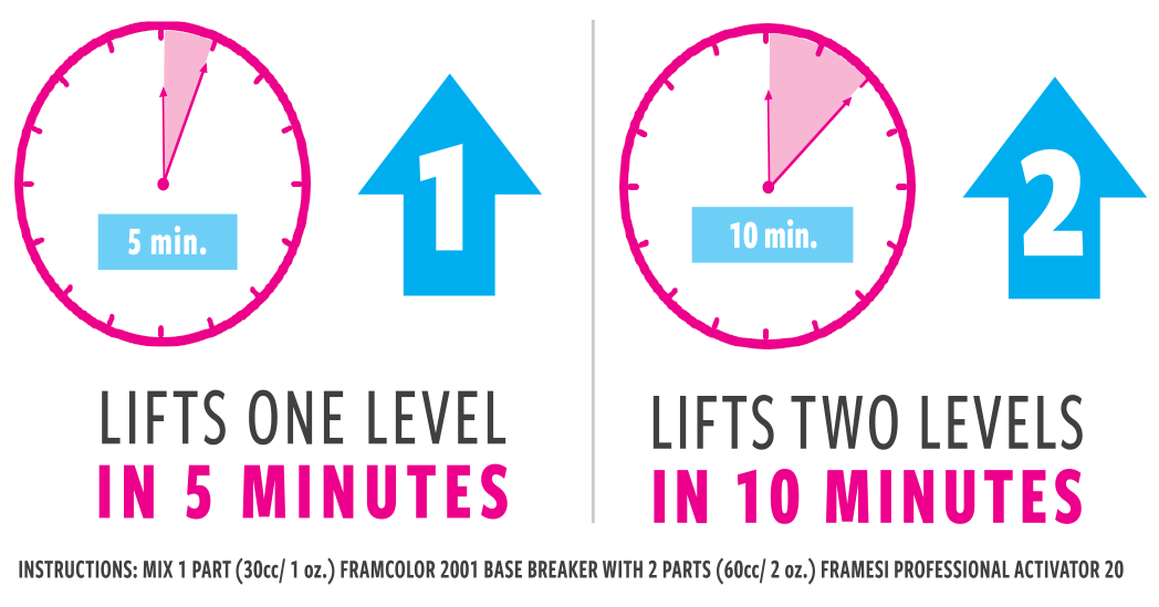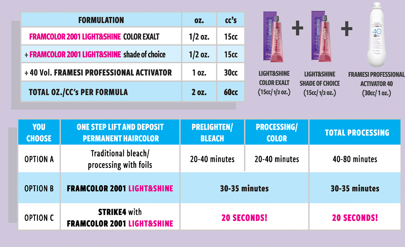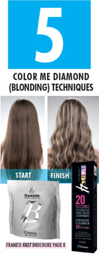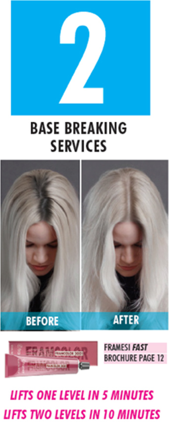 Includes 2 FRAMCOLOR 2001 INTENSE (5.00 & 7.00), FRAMCOLOR 2001 BASE BREAKER (COOL), DECOLOR B DIAMOND LIGHTENER and STRIKE4 FLAT IRON PROCESSING SHEETS