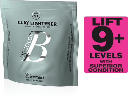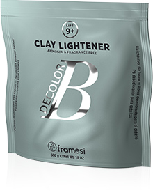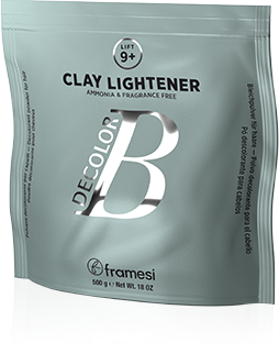 framesi® DECOLOR B® CLAY LIGHTENER contains vegetable derived clay powder that mixes to a creamy, thick consistency that stays moist without drying out. Extremely versatile bleach is ideal for all lightening techniques and can also be used on the scalp with 20 volume developer. Thanks to a pool of protective natural substances, even the most damaged hair is left with the ultimate condition and shine.