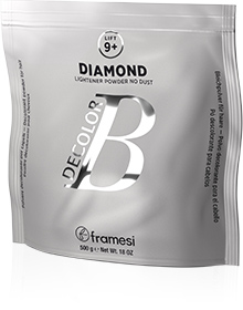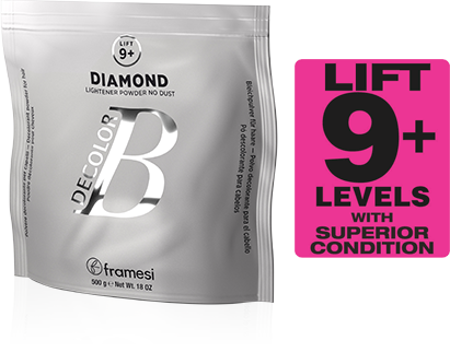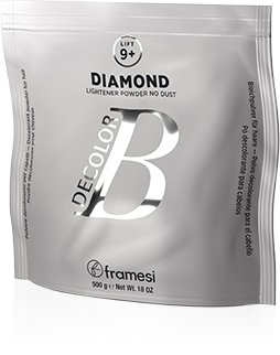 framesi® DECOLOR B® DIAMOND contains diamond powder that enhances the hair’s radiance and delicately smooths and polishes its surface, leaving it more compact. As a result, hair reflects light in a perfect way for lasting sparkle and shine.