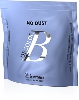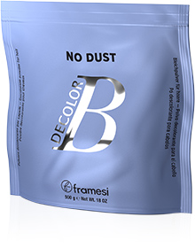 framesi® DECOLOR B® NO DUST has a gentle formula that provides great performance and top delicacy lightening for 7 levels or more. With cellulose derivatives of vegetable origin, it defends the hair throughout the process, leaving it moisturized deep down. The violet shade acts as a counter color to yellow, leaving the hair with a more refined tonality.