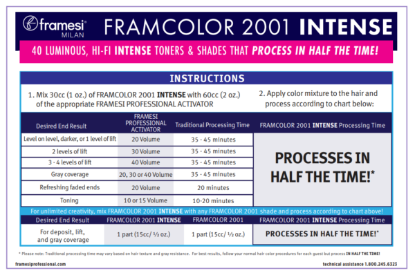 Includes 3 NEW platinum toners and hazelnut shades as well as a swatch card with all 6 NEW Framcolor 2001 INTENSE toners and hazelnut shades.