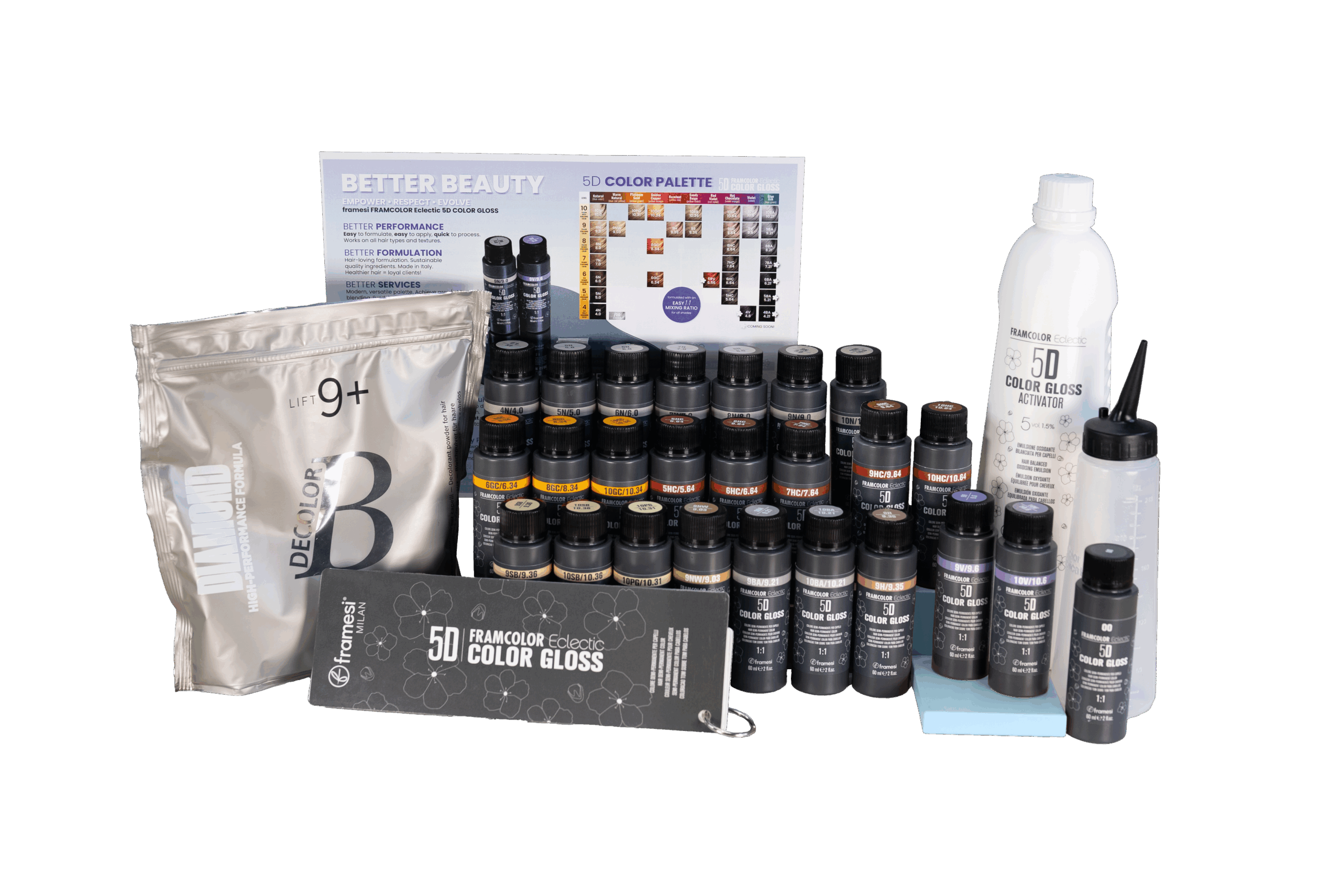 FRAMCOLOR 5D COLOR GLOSS is an easy-to-use demi-permanent liquid haircolor that provides superior conditioning, longevity, and shine.