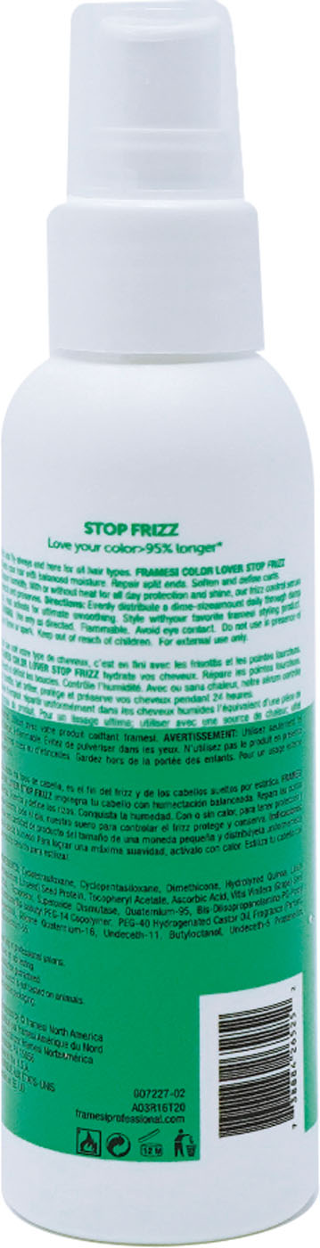 FRAMESI COLOR LOVER Stop Frizz infuses hair with balanced moisture. Repairs split ends, softens and defines curls, conquers humidity. Use with or without heat for all day protection and shine. Thermal tool activated for 24 hour smoothing. For 95% longer lasting color.