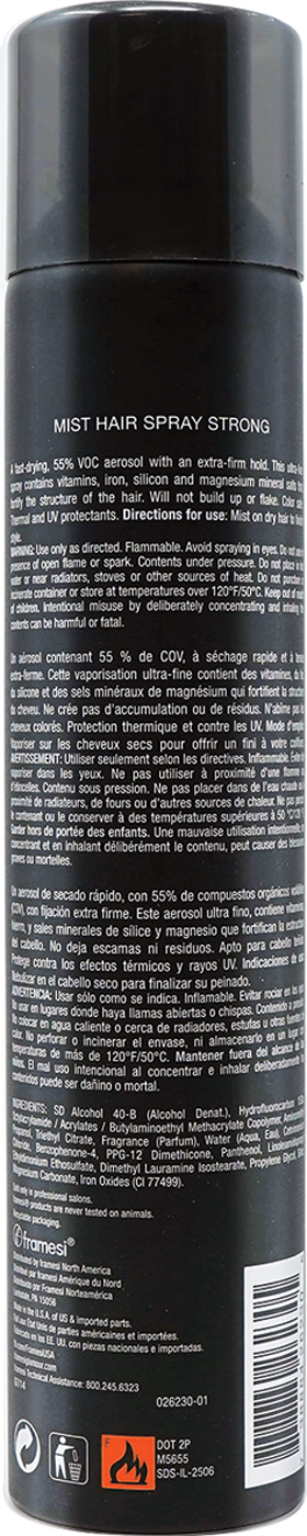 Framesi Mist Hair Spray Strong is a strong hold hairspray. This ultra-fine spray contains vitamins and volcanic ash, which fortify the structure of the hair.