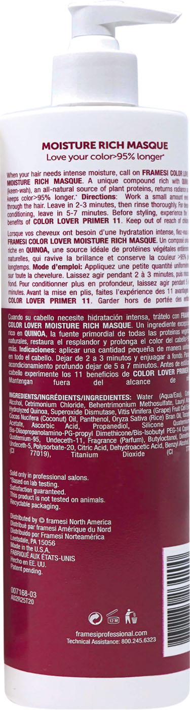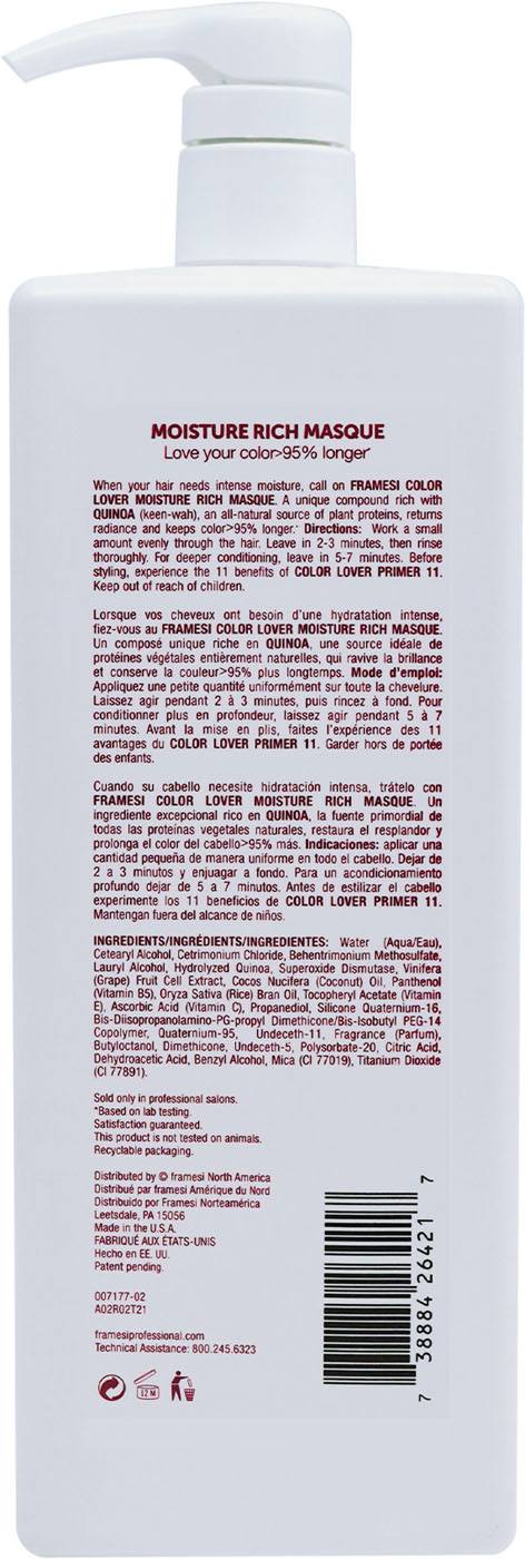 Framesi Moisture Rich Masque is a moisturizing treatment comprised of an advanced blend of Quinoa, natural oils and vitamins. These ingredients combine to deeply immerse hair in moisture and nutrients.