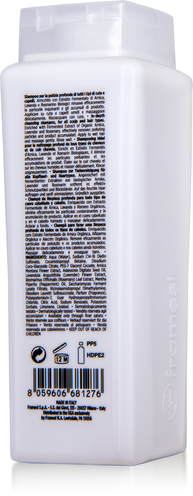 Gentle sulfate-free formula that deeply cleanses the hair and scalp. Enriched with Fermented Extracts of organic Arnica, Lavender, Rosemary Essential Oil, Peppermint, and Organic Baobab Oil, it effectively removes polluting particles and product build-up.