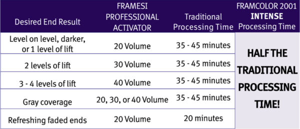 Finally, a non-progressive permanent haircolor that processes in HALF the processing time! Low cost at two applications per tube with a 1:2 mix ratio for 100% gray coverage and 4 levels of lift! After 3 years of research, and over 4000 on-head applications, enter framesi FRAMCOLOR 2001 INTENSE! Use alone or mix with framesi FRAMCOLOR 2001 for 112+ shades that process in HALF THE TIME!