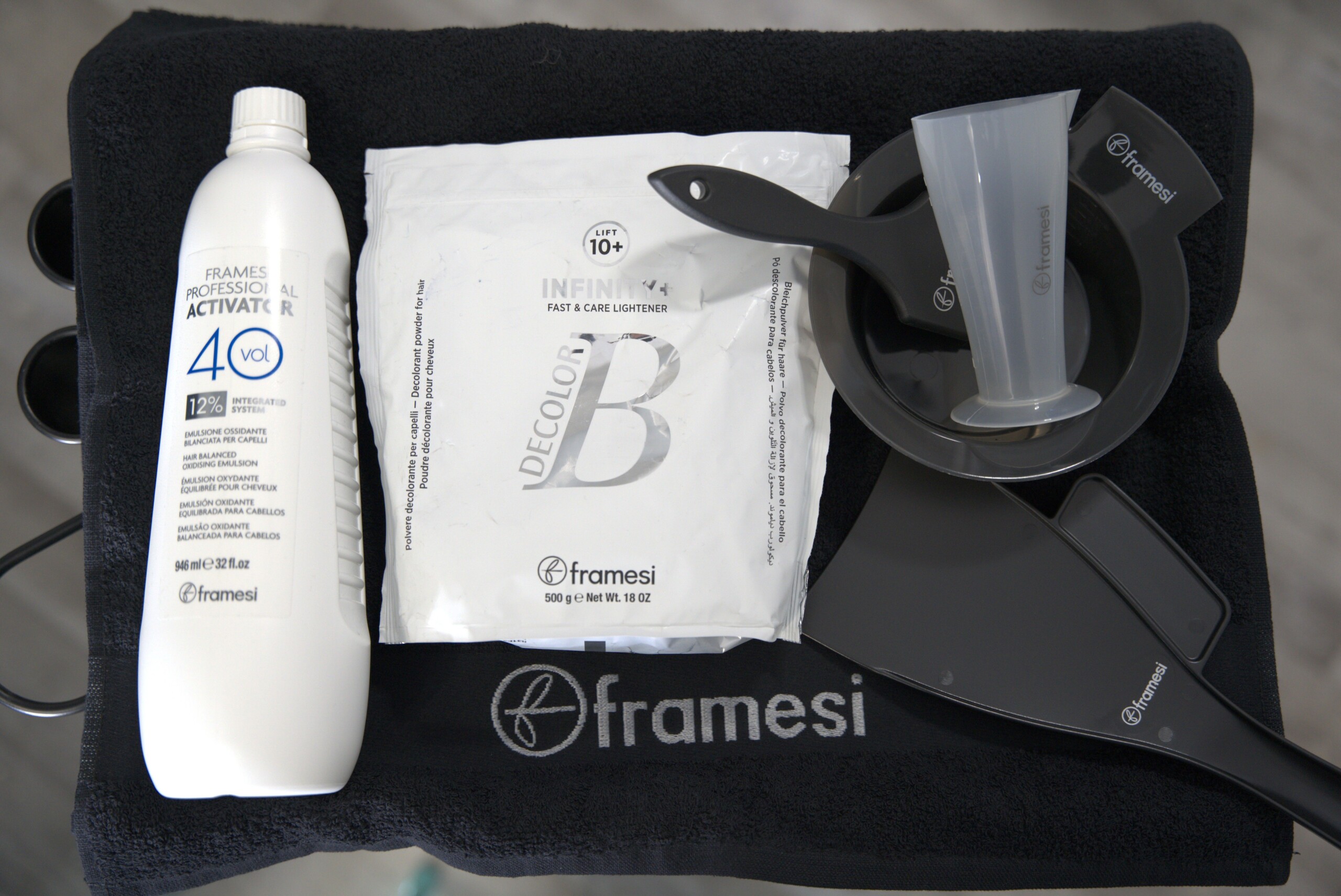 FORMULA 1 – Decolor B INFINITY+ Powder Lightener (1 scoop, 20cc/g) and Framesi Professional Activator 25 Volume (40 cc/g), in a 1:2 mix ratio (1 part lightener: 2 parts activator)