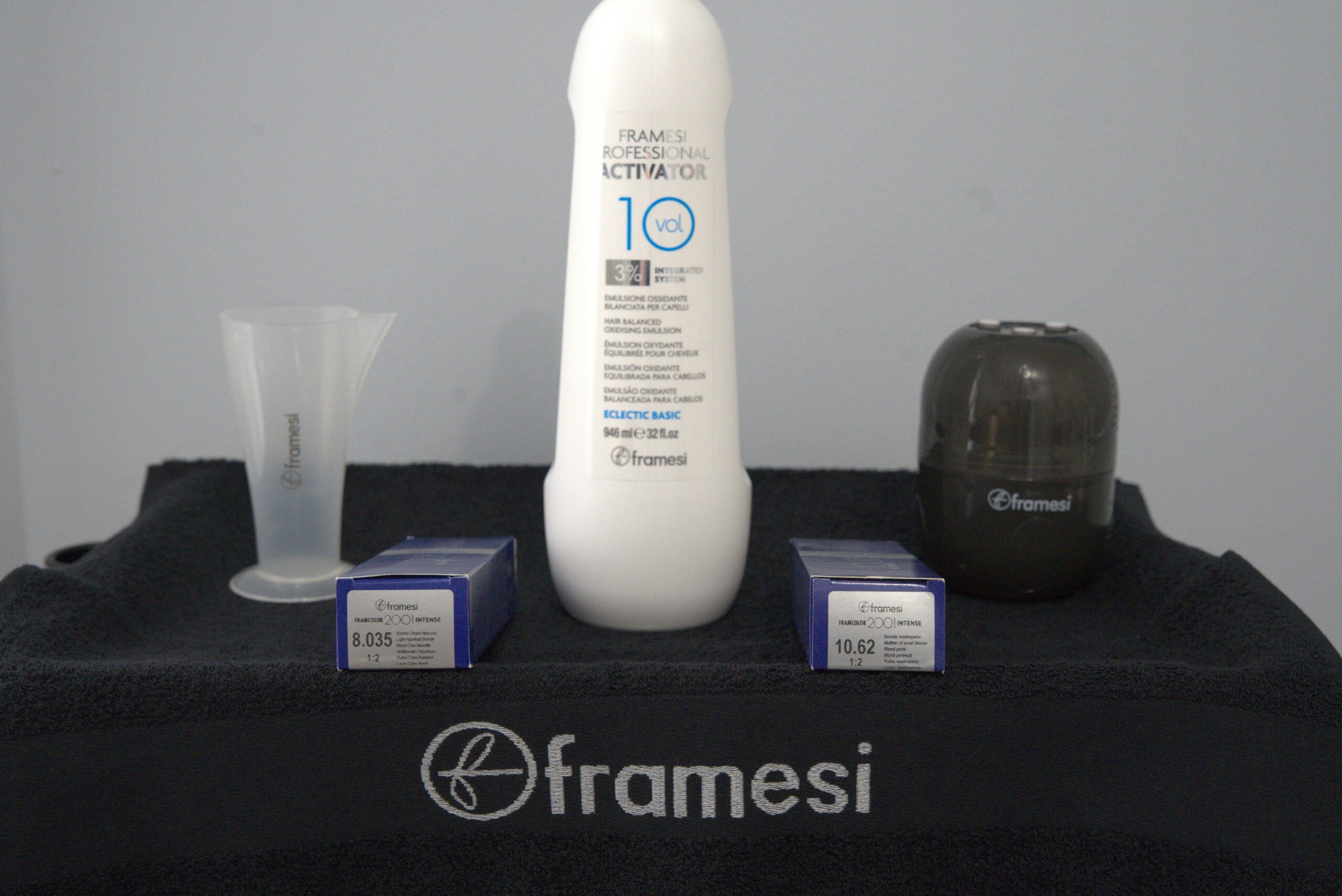 On our model from our IG Livestream, we used equal parts Framcolor 2001 INTENSE 8.035 + Framcolor 2001 INTENSE 10.62 with Framesi Professional Activator 10 volume, at a 1:2 mix ratio (1 part color: 2 parts activator) for permanent toning results in HALF THE TIME!